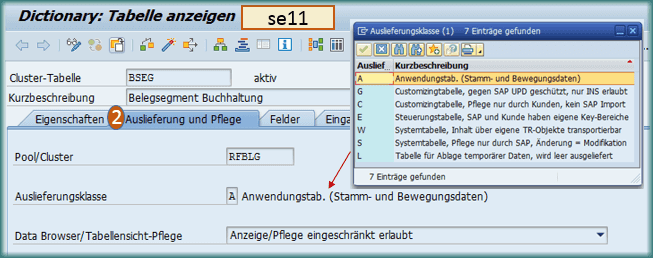 Hier wird im wesentlich die Pufferung festgelegt (Customizing Tabellen sind in der Regel immer gepuffert (d.h. im Hauptspeicher des Applikationsservers). Wichtig ist noch das Flag „Datenänderungen protokollieren“, das dazu führt, das jede Änderungen des Tabelleninhalts (siehe se11) protokolliert wird (siehe Transaktion scu3). Dies ist nur bei relativ kleinen Tabellen technisch sinnvoll.